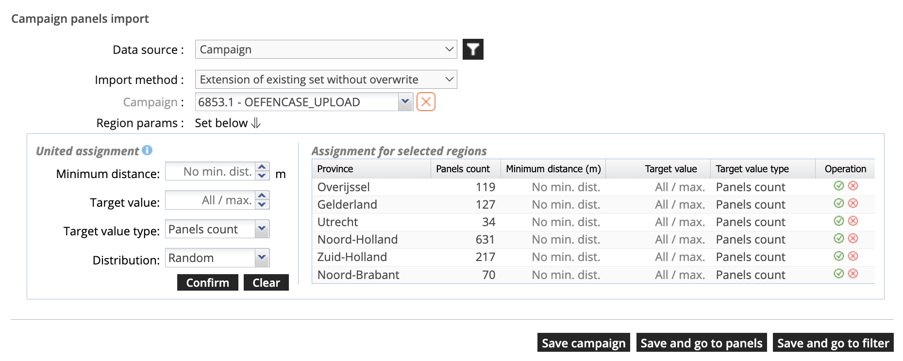 Nu wordt het spannend. In het tweede deel van het scherm (zie onder) geef je aan welke campagne je wilt gebruiken en of je dat met of zonder overschrijven van de campagne wilt doen. Voor de zekerheid kiezen we ‘without overwrite’. We selecteren de campagne OEFENCASE_UPLOAD, die we in het onderdeel ‘file uploaden’ hebben aangemaakt. IDS komt dan met het volgende scherm: