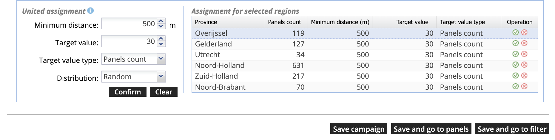 IDS laat een verdeling zien van de vlakken over de provincies waar ook daadwerkelijk vlakken staan. Als we nu het bereik gaan berekenen is er niets veranderd ten opzichte van de berekening die we eerder deden. Aanpassingen kun je nu maken in het linkerdeel van de tabel. Daar kan je aangeven hoeveel meter de vlakken minimaal van elkaar af mogen staan (Minimum distance) en hoeveel vlakken je per provincie wilt hebben. Als je dat hebt ingevoerd en op ‘Confirm’ klikt geeft IDS je een voorstel voor een nieuwe campagne met aangepaste aantallen. We vullen 500 meter en 30 vlakken per provincie in: