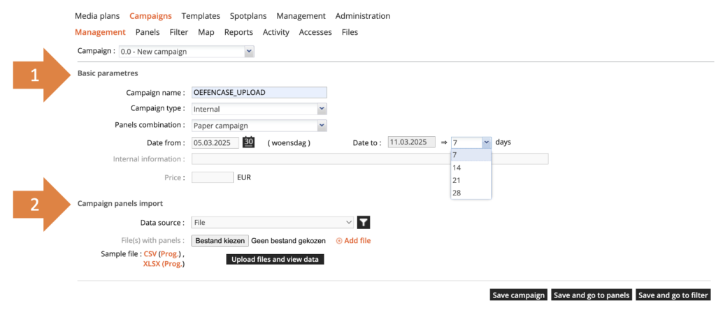 In dit geval hebben we gekozen voor een ‘Paper campaign’ omdat we zeker weten dat we straks een bestand gaan uploaden met daarin alleen analoge vlakken. Als daar ook digitale vlakken tussenstaan kan IDS de campagne niet opslaan. Het type ‘Panels combination’ moet altijd kloppen met het soort vlakken dat je gaat uploaden in je bestand. Zo niet, dan geeft IDS een foutmelding bij het opslaan van de campagne.