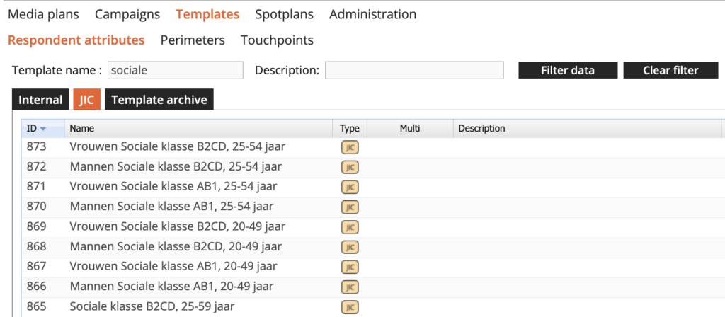 Wanneer je ‘Templates’ hebt geselecteerd kom je meteen in de sectie ‘Respondents attributes’, oftewel de respondentkenmerken waar je doelgroepen mee kan maken. In bovenstaand scherm is het tabblad ‘JIC’ geselecteerd waarin al een groot aantal doelgroepen zijn vastgelegd. In dit scherm is gezocht naar ‘sociale’. Dat zijn alle doelgroepen met ‘sociale’ in de de naam. Je kunt zoeken door een term achter ‘Template name’ te typen en vervolgens klik je op ‘Filter data’.