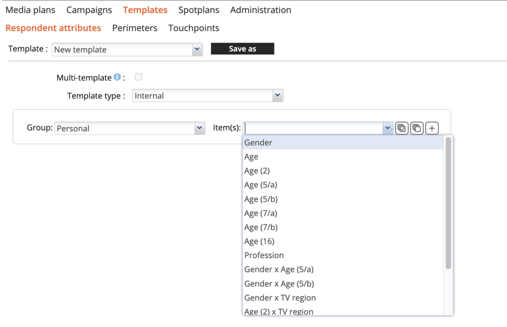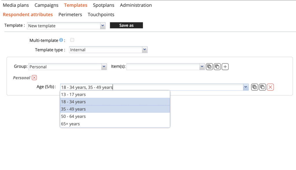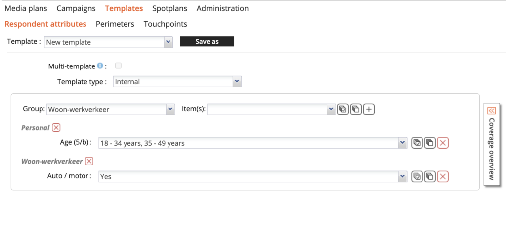 Bij ‘Group’ zijn alle respondentkenmerken gegroepeerd. Bij ‘Personal’ staan alle socio-demo’s op persoonsniveau zoals geslacht en leeftijd en bij ‘Household’ kun je huishoudgrootte aangeven. Verder zie je een groot aantal onderwerpen die te maken hebben met mobiliteit, werk en interesse. Ook is het mogelijk om een selectie te maken op basis van media-imperatives. Denk aan lichte radiogebruikers of zware TV-gebruikers.