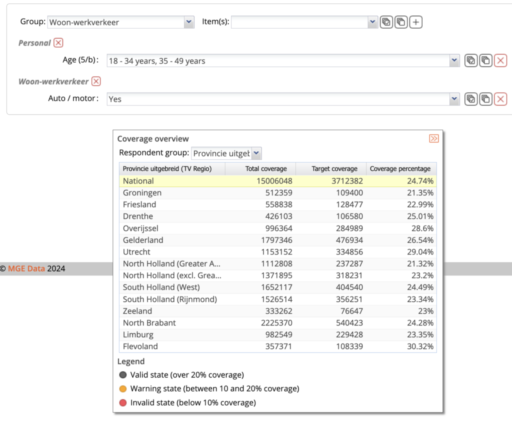 Helemaal rechts zie je een verticale button met de naam ‘Coverage overview’. Klik op de oranje pijltjes om de button te activeren. Er verschijnt nu een scherm met aantallen per provincie. Dit zijn de geëxtrapoleerde aantallen per provincie van de doelgroep die je aan het maken bent. Als de doelgroep te klein is veranderen de getallen van kleur. Zolang ze zwart blijven is niks aan de hand zoals in ons voorbeeld hieronder. Oranje geeft aan dat de doelgroep tussen de 10 en 20%, bij rood is dat zelfs onder de 10%. Uitkijken dus in termen van betrouwbaarheid van de resultaten.